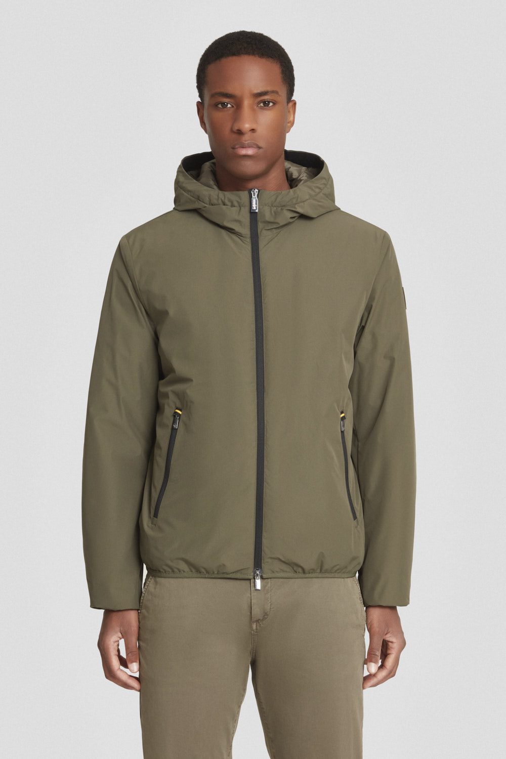 Giacca imbottita uomo verde militare con cappuccio dal design semplice e pulito.