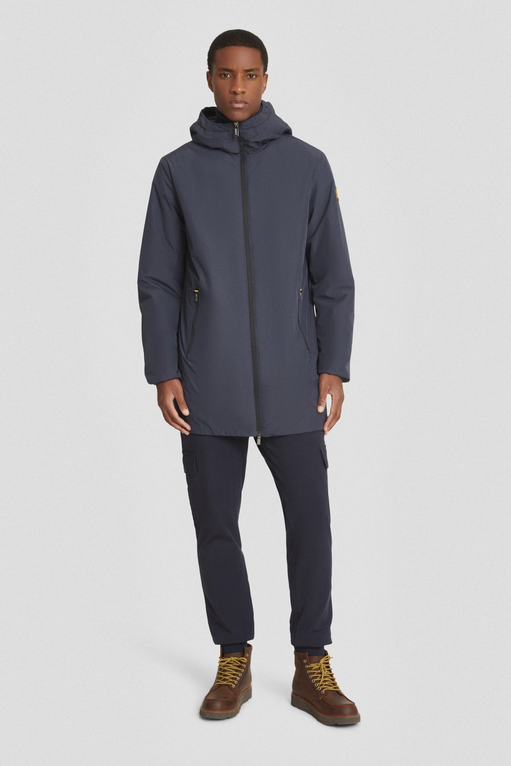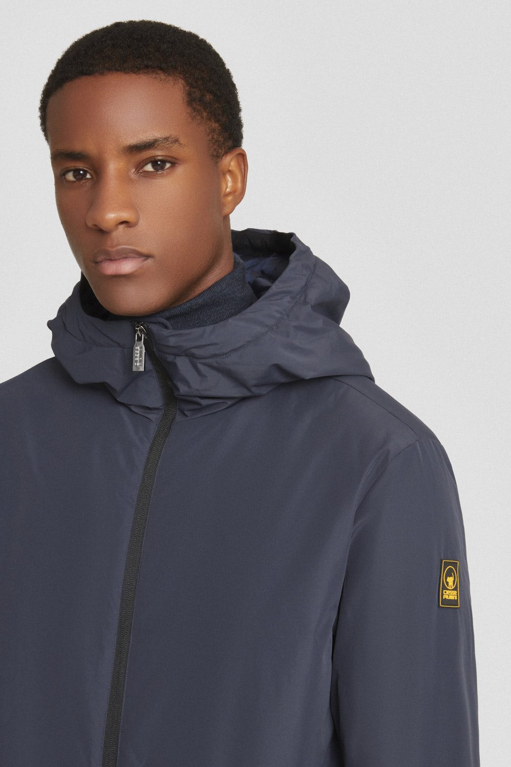 Giacca lunga blu con cappuccio, ideale dalla città alla natura, dall’autunno alla primavera.