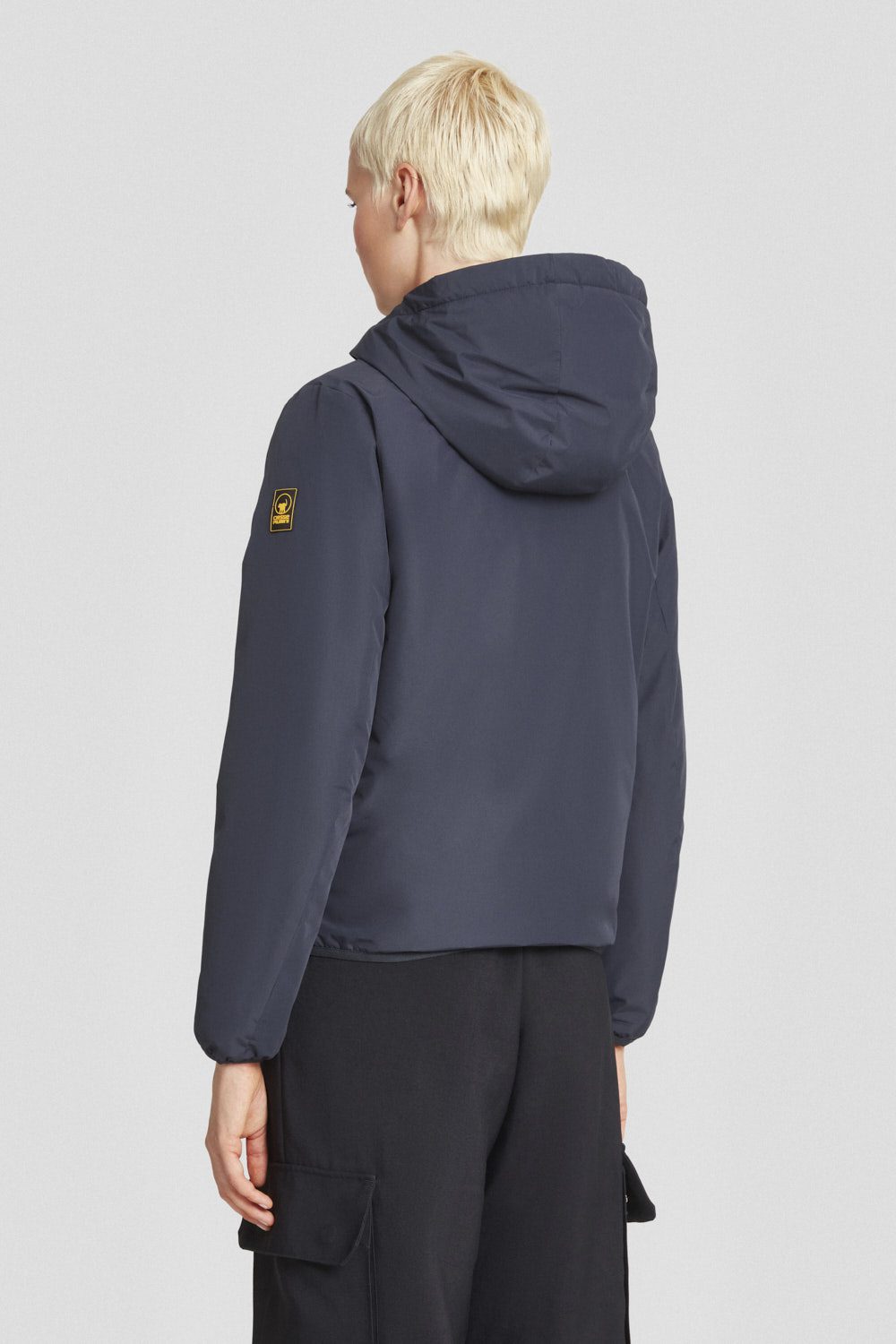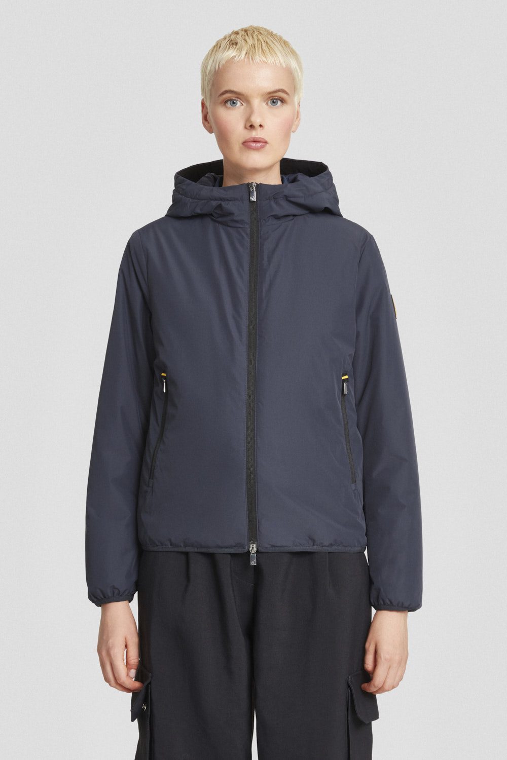 Giacca donna con cappuccio imbottita blu, realizzata in tessuto poly taslan: resistente, leggero e trattato DWR per una protezione efficace dagli agenti esterni.